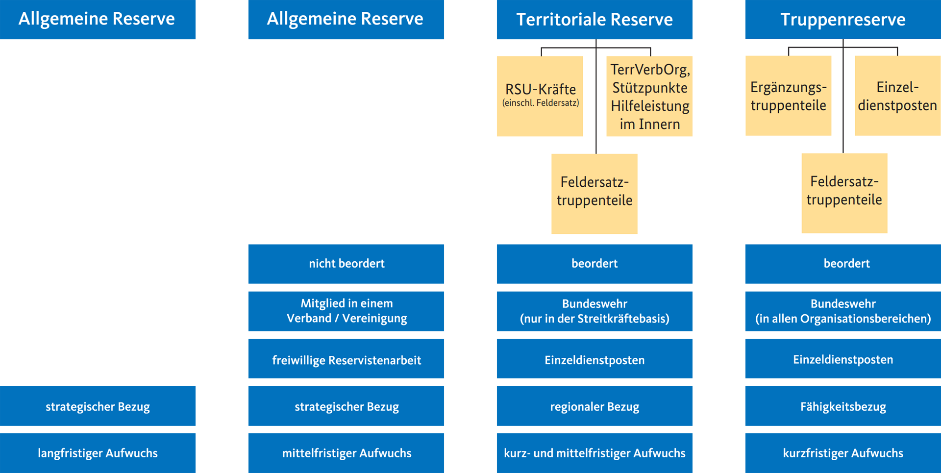 Aktive Truppe und Reserve sind gleichermaßen für die Aufgabenerfüllung der Bundeswehr unverzichtbar. Eine einsatzbereite Bundeswehr erfordert eine einsatzbereite Reserve. Die Reserve bildet das personelle Potenzial, das zur mittelbaren und unmittelbaren Unterstützung der Streitkräfte und ihrer Aufwuchsfähigkeit nötig ist. Dafür bedarf es insbesondere der entsprechenden materiellen und infrastrukturellen Ausstattung sowie logistischen Anbindung. Auf diese Weise aufgestellt und eingebunden, ist die Reserve eine wesentliche Säule der Landesverteidigung / Bündnisverteidigung. Dies schließt den Feldersatz ein. Auch für den Heimatschutz und die Fortsetzung der Aufgaben im Spannungs- oder Verteidigungsfall und der Aufgaben im Rahmen des Host Nation Support ist die Bundeswehr mit ihrer Reserve zum Aufwuchs zu befähigen, um die aktiven Kräfte ergänzen, unterstützen und entlasten zu können. Die dargestellte Aufgabenvielfalt erfordert eine flexible Reserve, die, teils im Frieden, teils in der Krise, rasch verfügbar gemacht werden muss. Das setzt eine entsprechende Einsatzbefähigung (Ausbildungshöhe und Professionalisierung) voraus. Andere Truppenteile erreichen ihre volle Einsatzbereitschaft erst nach einer Krisenausbildung. So müssen auch aufwuchsabhängige Truppenteile zur Unterstützung Verbündeter in Deutschland frühzeitig zur Verfügung stehen (z.B. Transportunterstützung, Sicherung, ABC-Abwehr, Militärpolizei, Cyber, Verbindungswesen zu Dienststellen im Inland). Ergänzungstruppenteile benötigen Vorbereitungszeit, um ihre Einsatzbereitschaft herzustellen.